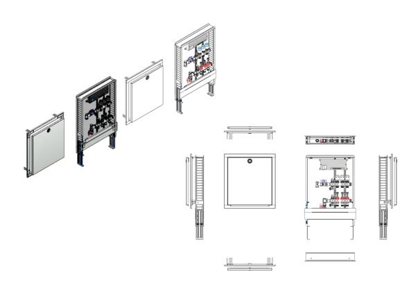 Die Anschlussstation für Flächenheizung und -kühlung ist im Unterputzschrank montiert und umfasst einen Edelstahlverteiler mit regulierbaren Durchflussanzeigern und Ventileinsätzen (M30x1,5), sowie eine vertikale Anschlussgarnitur ohne Wärmezählerverrohrung. Die vormontierten und verdrahteten Stellantriebe sind auf einer montierten Klemmleiste installiert.