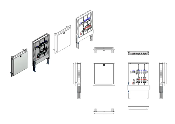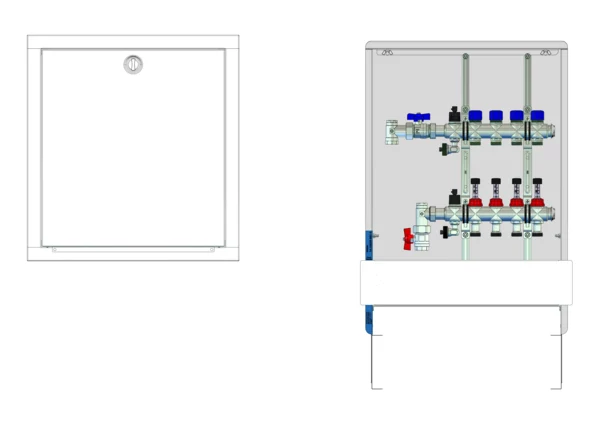 Die Anschlussstation für Flächenheizung und -kühlung ist im Unterputzschrank montiert und umfasst einen Edelstahlverteiler mit regulierbaren Durchflussanzeigern und Ventileinsätzen (M30x1,5), sowie eine vertikale Anschlussgarnitur ohne Wärmezählerverrohrung. Es gibt Platzhaltungen für eine Klemmleiste und Stellantriebe.
