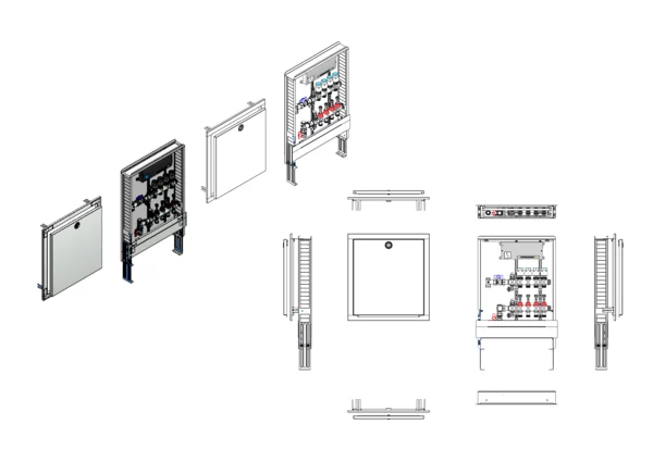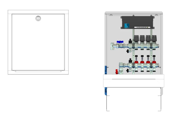 Die Anschlussstation für Flächenheizung und -kühlung ist im Unterputzschrank montiert und umfasst einen Edelstahlverteiler mit regulierbaren Durchflussanzeigern und Ventileinsätzen (M30x1,5), sowie eine vertikale Anschlussgarnitur ohne Wärmezählerverrohrung. Die vormontierten und verdrahteten Stellantriebe sind auf einer montierten Klemmleiste installiert.