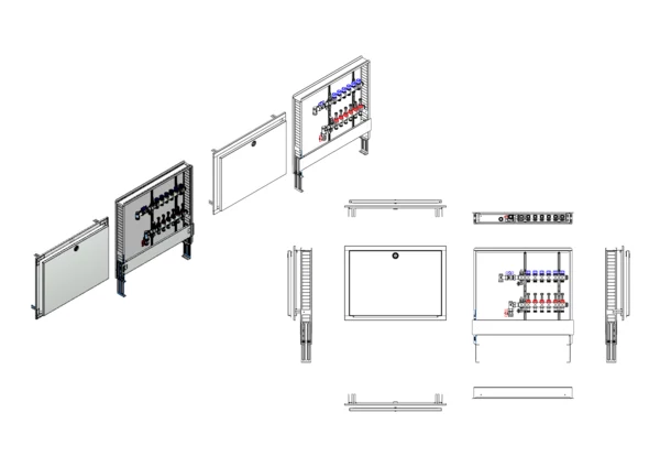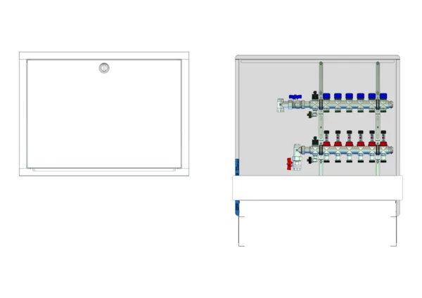 Die Anschlussstation für Flächenheizung und -kühlung ist im Unterputzschrank montiert und umfasst einen Edelstahlverteiler mit regulierbaren Durchflussanzeigern und Ventileinsätzen (M30x1,5), sowie eine vertikale Anschlussgarnitur ohne Wärmezählerverrohrung. Es gibt Platzhaltungen für eine Klemmleiste und Stellantriebe.