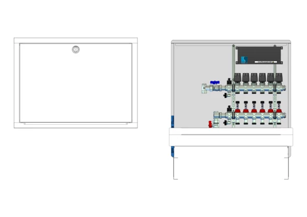 Die Anschlussstation für Flächenheizung und -kühlung ist im Unterputzschrank montiert und umfasst einen Edelstahlverteiler mit regulierbaren Durchflussanzeigern und Ventileinsätzen (M30x1,5), sowie eine vertikale Anschlussgarnitur ohne Wärmezählerverrohrung. Die vormontierten und verdrahteten Stellantriebe sind auf einer montierten Klemmleiste installiert.