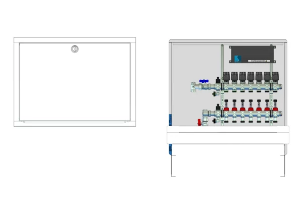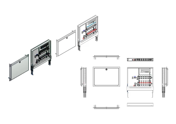 Die Anschlussstation für Flächenheizung und -kühlung ist im Unterputzschrank montiert und umfasst einen Edelstahlverteiler mit regulierbaren Durchflussanzeigern und Ventileinsätzen (M30x1,5), sowie eine vertikale Anschlussgarnitur ohne Wärmezählerverrohrung. Die vormontierten und verdrahteten Stellantriebe sind auf einer montierten Klemmleiste installiert.