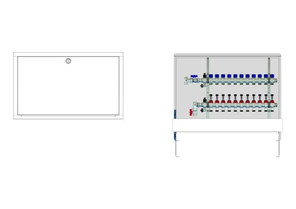Die Anschlussstation für Flächenheizung und -kühlung ist im Unterputzschrank montiert und umfasst einen Edelstahlverteiler mit regulierbaren Durchflussanzeigern und Ventileinsätzen (M30x1,5), sowie eine vertikale Anschlussgarnitur ohne Wärmezählerverrohrung. Es gibt Platzhaltungen für eine Klemmleiste und Stellantriebe.