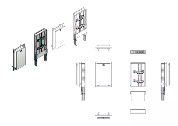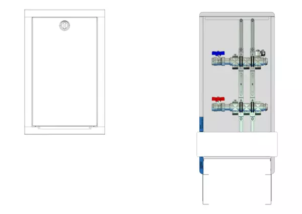 horizontale Anschlusgarnitur ohne Wärmezählerverrohrung, Verteiler ohne Einbauten, Standard-Unterputz-Schrank mit Frontblende in RAL 9016