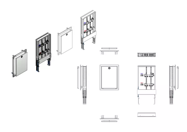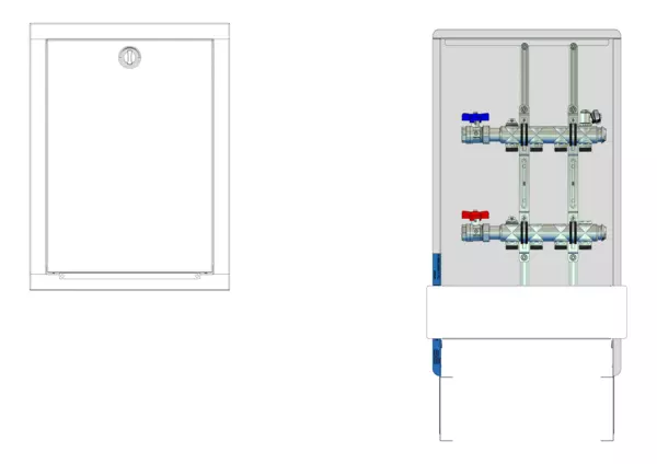 horizontale Anschlusgarnitur ohne Wärmezählerverrohrung, Verteiler ohne Einbauten, Standard-Unterputz-Schrank mit Frontblende in RAL 9016