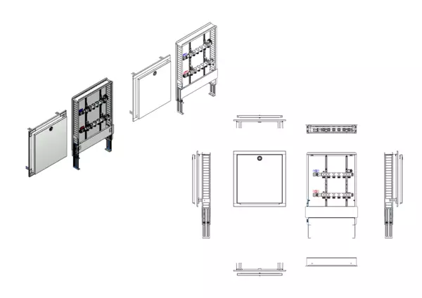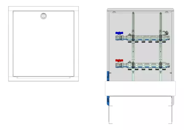 horizontale Anschlusgarnitur ohne Wärmezählerverrohrung, Verteiler ohne Einbauten, Standard-Unterputz-Schrank mit Frontblende in RAL 9016