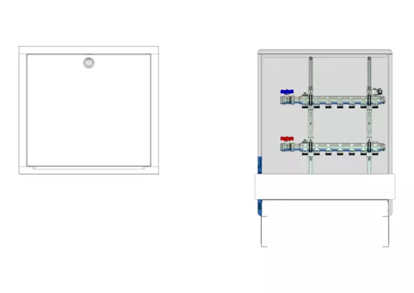 horizontale Anschlusgarnitur ohne Wärmezählerverrohrung, Verteiler ohne Einbauten, Standard-Unterputz-Schrank mit Frontblende in RAL 9016