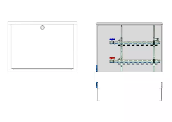 horizontale Anschlusgarnitur ohne Wärmezählerverrohrung, Verteiler ohne Einbauten, Standard-Unterputz-Schrank mit Frontblende in RAL 9016