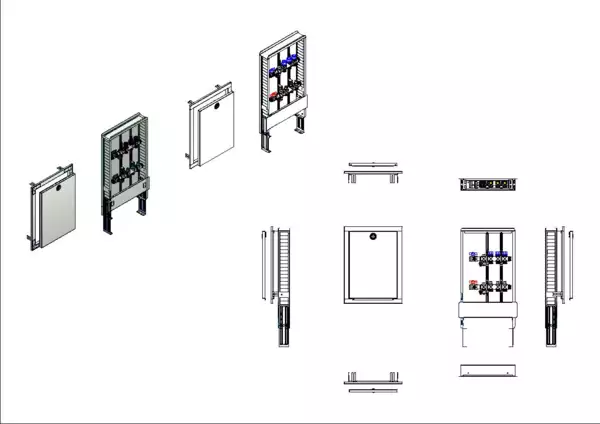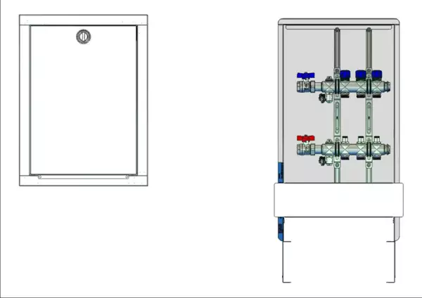 Die Anschlussstation für Flächenheizung und -kühlung ist im Unterputzschrank montiert und umfasst einen Edelstahlverteiler mit integrierten Regulierventilen und Ventileinsätzen (M30x1,5), sowie eine horizontale Anschlussgarnitur ohne Wärmezählerverrohrung. Es gibt Platzhaltungen für eine Klemmleiste und Stellantriebe.