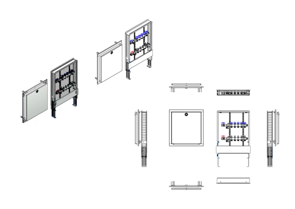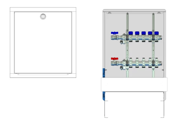 Die Anschlussstation für Flächenheizung und -kühlung ist im Unterputzschrank montiert und umfasst einen Edelstahlverteiler mit integrierten Regulierventilen und Ventileinsätzen (M30x1,5), sowie eine horizontale Anschlussgarnitur ohne Wärmezählerverrohrung. Es gibt Platzhaltungen für eine Klemmleiste und Stellantriebe.