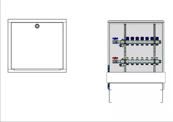 strawa FB-Anschlussstation H 53h 7 Hkr.,BxHxT: 600 x 725 x 92 mm, horiz. AG o. WMZ, Verteiler mit Regulierventil + THV M30x1,5, Standard-UP-Schrank mit Frontblende in RAL 9016