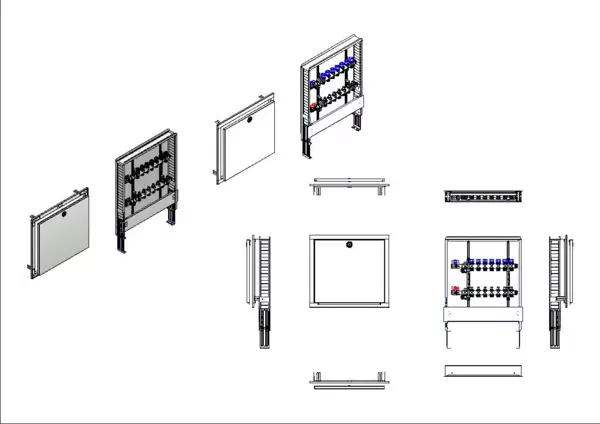 Die Anschlussstation für Flächenheizung und -kühlung ist im Unterputzschrank montiert und umfasst einen Edelstahlverteiler mit integrierten Regulierventilen und Ventileinsätzen (M30x1,5), sowie eine horizontale Anschlussgarnitur ohne Wärmezählerverrohrung. Es gibt Platzhaltungen für eine Klemmleiste und Stellantriebe.