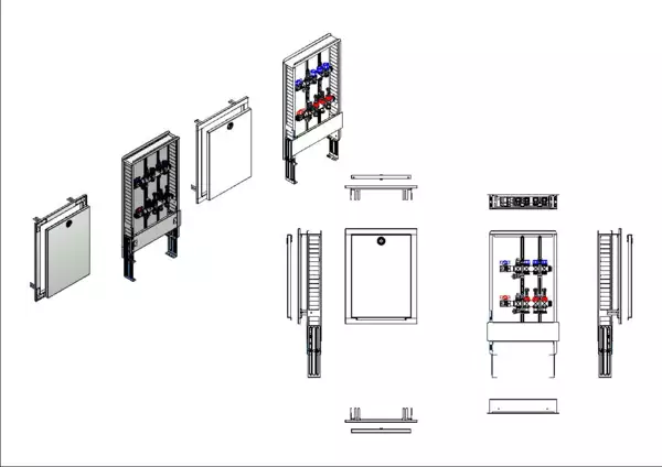 strawa FB-Anschlussstation H 63h 3 Hkr.,BxHxT: 410x725x92 mm, horiz. AG o. WMZ, Verteiler mit DFA 0-3 l/min + THV M30x1,5, Standard-UP-Schrank mit Frontblende in RAL 9016