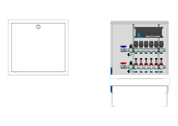 strawa FB-Anschlussstation H 63h-X 6 Hkr.,BxHxT: 600 x 725 x 92 mm, horiz. AG o. WMZ, Verteiler mit DFA 0-3 l/min + THV M30x1,5, vorm. Stellantr.+Klemml. m. Vorverdraht., Standard-UP-Schrank mit Frontblende in RAL 9016