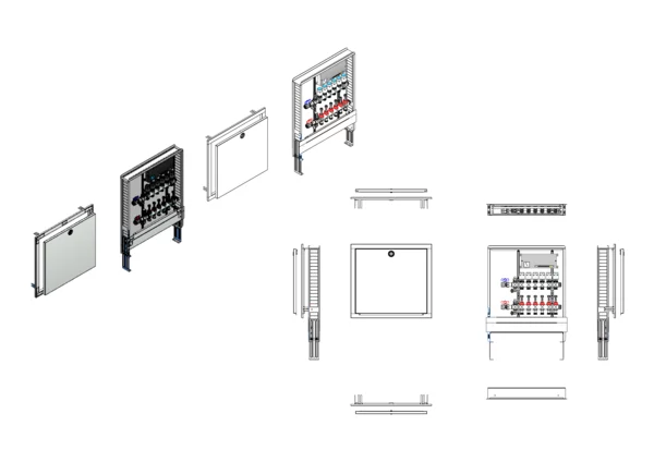 Die Anschlussstation für Flächenheizung ist im Unterputzschrank montiert und umfasst einen Edelstahlverteiler mit regulierbaren Durchflussanzeigern und Ventileinsätzen (M30x1,5), sowie eine horizontale Anschlussgarnitur ohne Wärmezählerverrohrung. Die vormontierten und verdrahteten Stellantriebe sind auf einer montierten Klemmleiste installiert.