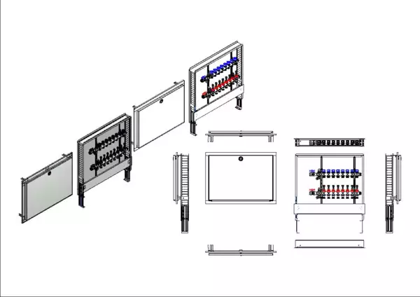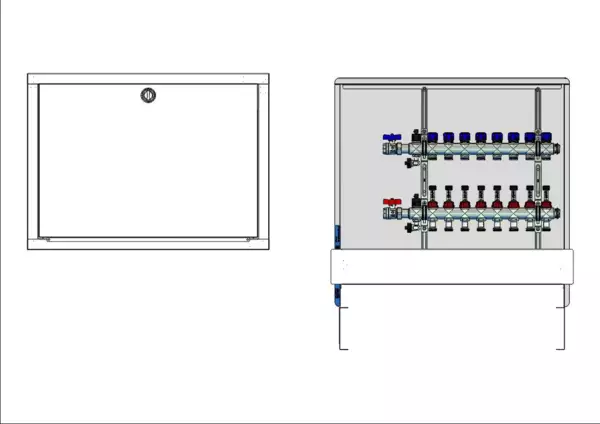 strawa FB-Anschlussstation H 63h 8 Hkr.,BxHxT: 750x725x92 mm, horiz. AG o. WMZ, Verteiler mit DFA 0-3 l/min + THV M30x1,5, Standard-UP-Schrank mit Frontblende in RAL 9016