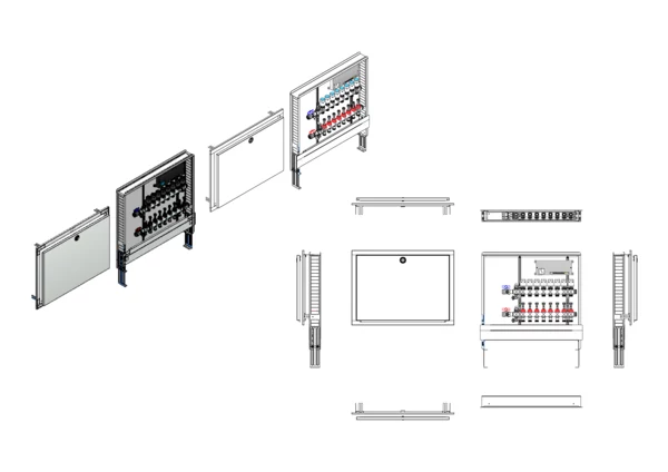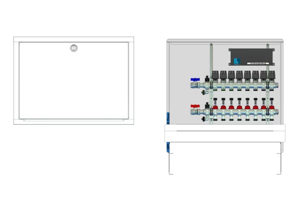 Die Anschlussstation für Flächenheizung ist im Unterputzschrank montiert und umfasst einen Edelstahlverteiler mit regulierbaren Durchflussanzeigern und Ventileinsätzen (M30x1,5), sowie eine horizontale Anschlussgarnitur ohne Wärmezählerverrohrung. Die vormontierten und verdrahteten Stellantriebe sind auf einer montierten Klemmleiste installiert.