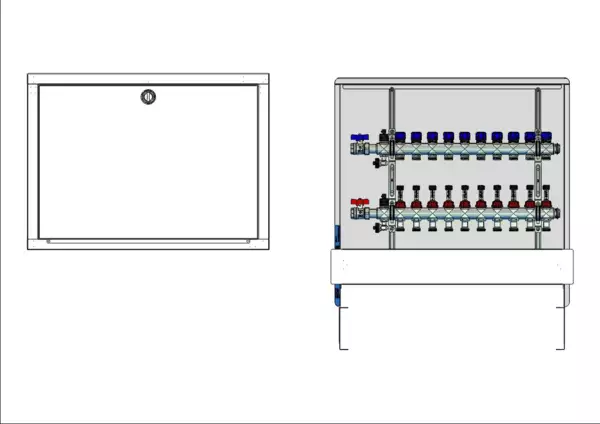 strawa FB-Anschlussstation H 63h 10 Hkr.,BxHxT: 750 x 725 x 92 mm, horiz. AG o. WMZ, Verteiler mit DFA 0-3 l/min + THV M30x1,5, Standard-UP-Schrank mit Frontblende in RAL 9016