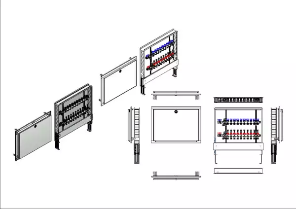 Die Anschlussstation für Flächenheizung und -kühlung ist im Unterputzschrank montiert und umfasst einen Edelstahlverteiler mit regulierbaren Durchflussanzeigern und Ventileinsätzen (M30x1,5), sowie eine horizontale Anschlussgarnitur ohne Wärmezählerverrohrung. Es gibt Platzhaltungen für eine Klemmleiste und Stellantriebe.