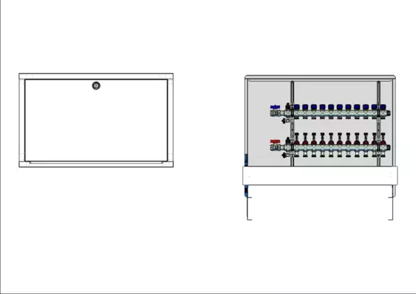 strawa FB-Anschlussstation H 63h 11 Hkr.,BxHxT: 900 x 725 x 92 mm, horiz. AG o. WMZ, Verteiler mit DFA 0-3 l/min + THV M30x1,5, Standard-UP-Schrank mit Frontblende in RAL 9016