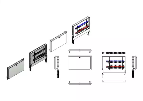 Die Anschlussstation für Flächenheizung und -kühlung ist im Unterputzschrank montiert und umfasst einen Edelstahlverteiler mit regulierbaren Durchflussanzeigern und Ventileinsätzen (M30x1,5), sowie eine horizontale Anschlussgarnitur ohne Wärmezählerverrohrung. Es gibt Platzhaltungen für eine Klemmleiste und Stellantriebe.