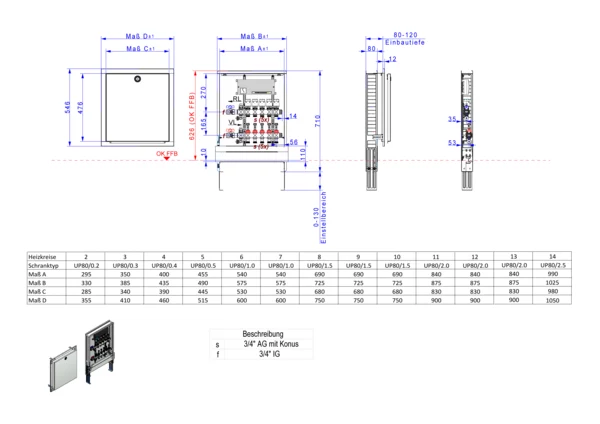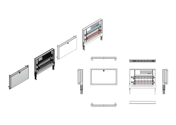 Die Anschlussstation für Flächenheizung ist im Unterputzschrank montiert und umfasst einen Edelstahlverteiler mit regulierbaren Durchflussanzeigern und Ventileinsätzen (M30x1,5), sowie eine horizontale Anschlussgarnitur ohne Wärmezählerverrohrung. Die vormontierten und verdrahteten Stellantriebe sind auf einer montierten Klemmleiste installiert.