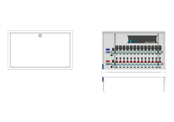 horizontale Anschlusgarnitur ohne Wärmezählerverrohrung, Verteiler mit Durchflussanzeiger 0-3 l/min im Vorlaufbalken und Thermostatventileinsatz M30x1,5 im Rücklaufbalken, vormontierte Stellantriebe und Klemmleiste mit Vorverdrahtung, Standard-Unterputz-Schrank mit Frontblende in RAL 9016