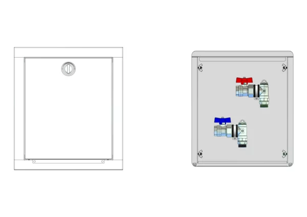 1. ohnungsanschluss, vertikale Anaschlussgarnitur ohne Wärmezählerverrohrung, Standard-Unterputz-Wandschrank mit Frontblende in RAL 9016