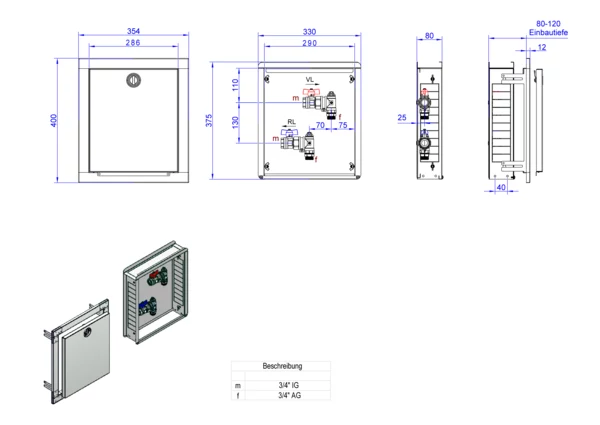 Die Anschlussstation ist für Wohnungsanschlüsse geeignet. Sie dient zum Absperren des Wohnungsstranges, zum Beispiel für Wartungsarbeiten. Im Standard-Wandschrank mit Frontblende in weiß RAL 9016 mit einer Einbautiefe von 80 bis 120 mm ist eine Edelstahlverrohrung mit einer horizontalen Anschlussgarnitur ohne Wärmezählervorbereitung und ohne zusätzliche Reguliereinbauten schallentkoppelt montiert.