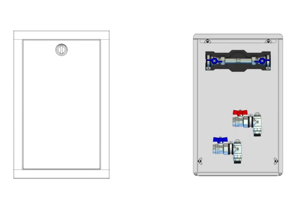 Die Wohnungsanschlussstation ist ohne Wärmezählervorbereitung im Wand-Unterputzschrank montiert. Sie umfasst eine Wasserzählervorbereitung für Trinkwasser kalt. Der Primäranschluss ist horizontal.