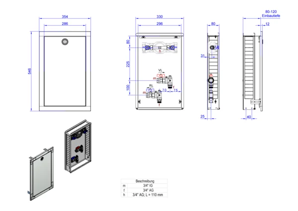 Die Anschlussstation ist für Wohnungsanschlüsse geeignet. Sie dient zum Absperren des Wohnungsstranges, zum Beispiel für Wartungsarbeiten. Im Standard-Wandschrank mit Frontblende in weiß RAL 9016 mit einer Einbautiefe von 80 bis 120 mm ist eine Edelstahlverrohrung mit einer horizontalen Anschlussgarnitur ohne Wärmezählervorbereitung und ohne zusätzliche Reguliereinbauten schallentkoppelt montiert. In der Anschlussstation ist zusätzlich eine Wasserzählervorbereitung 3/4" AG Länge 110 mm mit Absperrungen für kaltes Trinkwasser montiert.