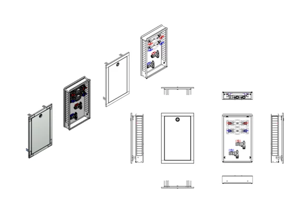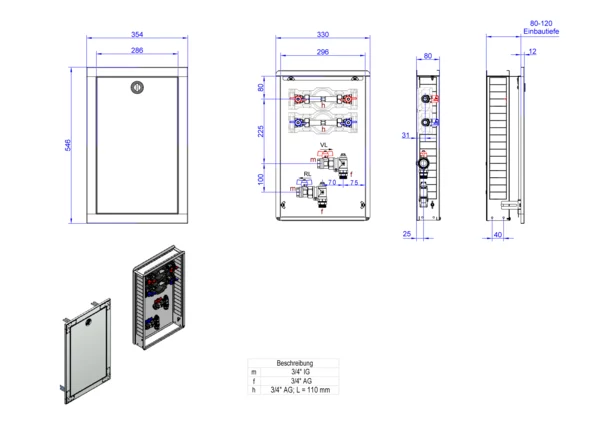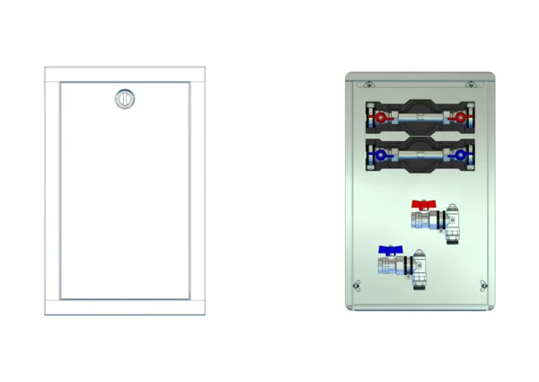 Die Anschlussstation ist für Wohnungsanschlüsse geeignet. Sie dient zum Absperren des Wohnungsstranges, zum Beispiel für Wartungsarbeiten. Im Standard-Wandschrank mit Frontblende in weiß RAL 9016 mit einer Einbautiefe von 80 bis 120 mm ist eine Edelstahlverrohrung mit einer horizontalen Anschlussgarnitur ohne Wärmezählervorbereitung und ohne zusätzliche Reguliereinbauten schallentkoppelt montiert. In der Anschlussstation ist zusätzlich eine Wasserzählervorbereitung 3/4" AG Länge 110 mm mit Absperrungen für kaltes und warmes Trinkwasser montiert.