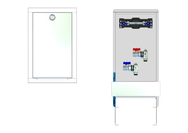 Die Wohnungsanschlussstation ist ohne Wärmezählervorbereitung im Unterputzschrank montiert. Sie umfasst eine Wasserzählervorbereitung für Trinkwasser kalt. Der Primäranschluss ist horizontal.