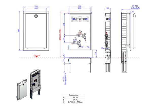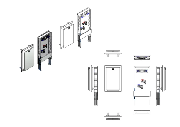 Die Anschlussstation ist für Wohnungsanschlüsse geeignet. Sie dient zum Absperren des Wohnungsstranges, zum Beispiel für Wartungsarbeiten. Im Standard-Unterputzschrank mit Frontblende in weiß RAL 9016 mit einer Einbautiefe von 80 bis 120 mm ist eine Edelstahlverrohrung mit einer horizontalen Anschlussgarnitur ohne Wärmezählervorbereitung und ohne zusätzliche Reguliereinbauten schallentkoppelt montiert. In der Anschlussstation ist zusätzlich eine Wasserzählervorbereitung 3/4" AG Länge 110 mm mit Absperrungen für kaltes Trinkwasser montiert.