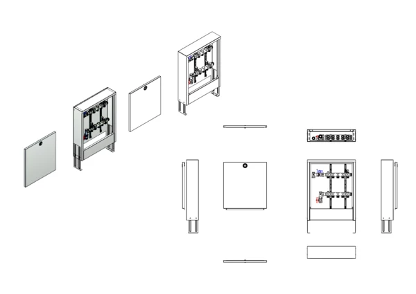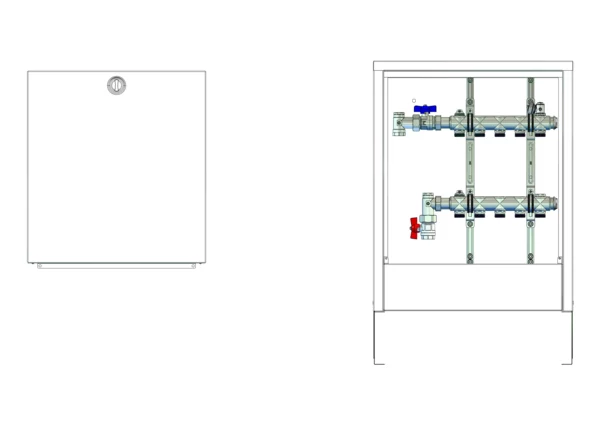 vertikale Anschlussgarnitur ohne Wärmezählerverrohrung, Verteiler ohne Einbauten, Standard-Aufputz-Schrank in RAL 9016