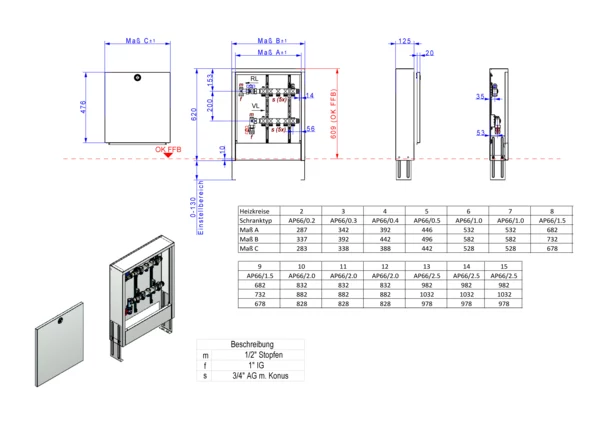 vertikale Anschlussgarnitur ohne Wärmezählerverrohrung, Verteiler ohne Einbauten, Standard-Aufputz-Schrank in RAL 9016