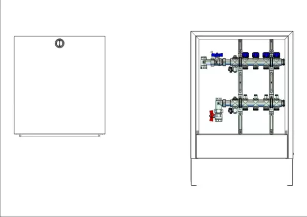 Die Anschlussstation für Flächenheizung und -kühlung ist im Aufputz-Schrank montiert und umfasst einen Edelstahlverteiler mit integrierten Regulierventilen und Ventileinsätzen (M30×1,5) sowie eine vertikale Anschlussgarnitur ohne Wärmezählerverrohrung. Es gibt Platzhaltungen für eine Klemmleiste und Stellantriebe.