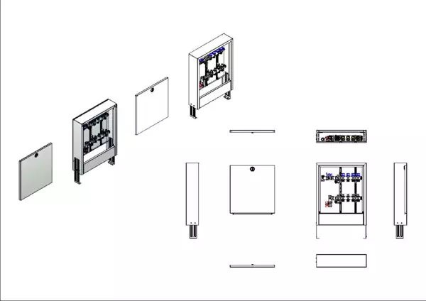 strawa FB-Anschlussstation H 53-AP 4 Hkr.,BxHxT: 496x620x125 mm, vert. AG o. WMZ, Verteiler mit Regulierventil + THV M30x1,5, Standard-AP-Schrank in RAL 9016