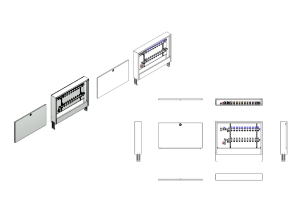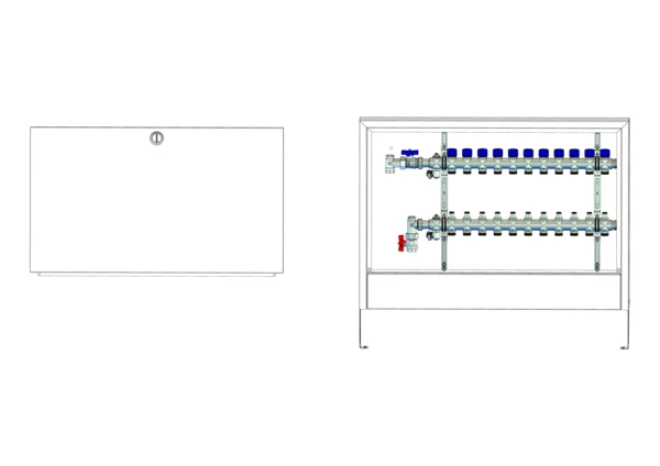 strawa FB-Anschlussstation H 53-AP 11 Hkr.,BxHxT: 882x620x125 mm, vert. AG o. WMZ, Verteiler mit Regulierventil + THV M30x1,5, Standard-AP-Schrank in RAL 9016