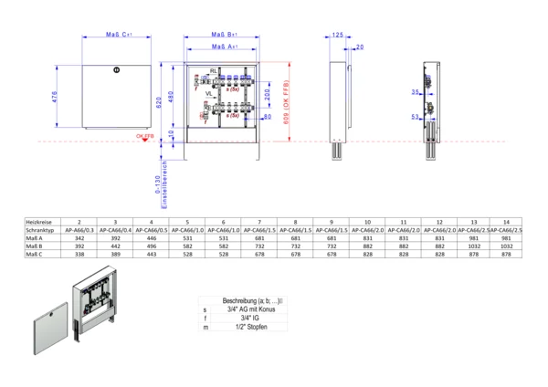 Die Anschlussstation für Flächenheizung und -kühlung ist im Aufputzschrank montiert und umfasst einen Edelstahlverteiler mit integrierten Regulierventilen und Ventileinsätzen (M30x1,5), sowie eine vertikale Anschlussgarnitur ohne Wärmezählerverrohrung. Es gibt Platzhaltungen für eine Klemmleiste und Stellantriebe.