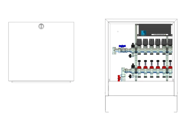 strawa FB-Anschlussstation H 63-AP-X 6 Hkr.,BxHxT: 582x620x125 mm, vert. AG o. WMZ, Verteiler mit DFA 0-3 l/min + THV M30x1,5, vorm. Stellantr.+Klemml. m. Vorverdraht., Standard-AP-Schrank in RAL 9016