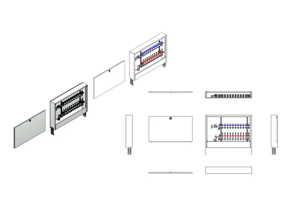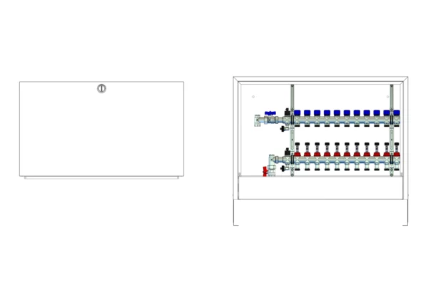 Die Anschlussstation für Flächenheizung und -kühlung ist im Aufputzschrank montiert und umfasst einen Edelstahlverteiler mit regulierbaren Durchflussanzeigern und Ventileinsätzen (M30x1,5), sowie eine vertikale Anschlussgarnitur ohne Wärmezählerverrohrung. Es gibt Platzhaltungen für eine Klemmleiste und Stellantriebe.