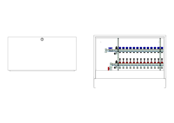 Die Anschlussstation für Flächenheizung und -kühlung ist im Aufputzschrank montiert und umfasst einen Edelstahlverteiler mit regulierbaren Durchflussanzeigern und Ventileinsätzen (M30x1,5), sowie eine vertikale Anschlussgarnitur ohne Wärmezählerverrohrung. Es gibt Platzhaltungen für eine Klemmleiste und Stellantriebe.