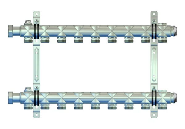 Der Anschlussverteiler für den Heizkörperanschluss ist ein Edelstahlverteiler ohne zusätzliche Einbauten in den Heizkreisabgängen. Die Anschlussgarnitur am Primäranschluss ist separat erhältlich, wodurch die Möglichkeit besteht, verschiedene Anschlussgarnituren mit oder ohne Wärmezählerverrohrung auszuwählen.