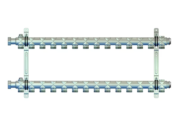 Der Anschlussverteiler für den Heizkörperanschluss ist ein Edelstahlverteiler ohne zusätzliche Einbauten in den Heizkreisabgängen. Die Anschlussgarnitur am Primäranschluss ist separat erhältlich, wodurch die Möglichkeit besteht, verschiedene Anschlussgarnituren mit oder ohne Wärmezählerverrohrung auszuwählen.
