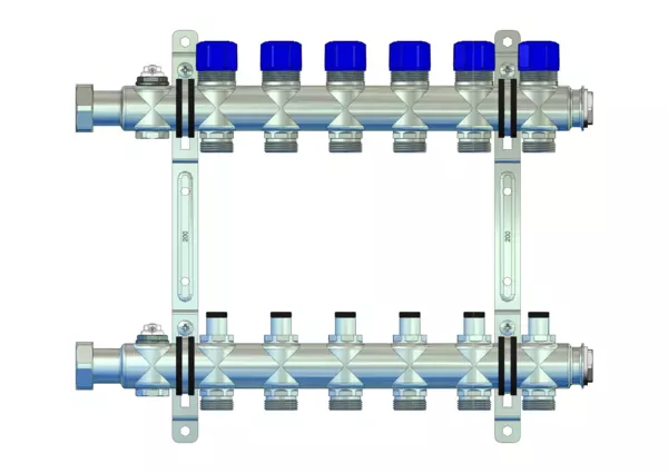 Der Anschlussverteiler für Flächenheizung und -kühlung steht für einen herausragenden hydraulischen Abgleich der Heizkreise durch die Integration von manuell regulierbaren Ventilen im Vorlaufbalken und Ventileinsätzen (M30x1,5) im Rücklaufbalken. Die Anschlussgarnitur am Primäranschluss ist separat erhältlich und bietet die Flexibilität, unterschiedliche Anschlussgarnituren mit oder ohne Wärmezählerverrohrung zu wählen.
