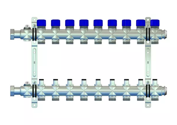 strawa FB-Anschlussverteiler e-class 53 ohne SFEE 9 Hkr.,BxHxT: 545x320x67 mm, integr. Regulierventil im VL und THV M30x1,5 im RL, Entlüftungsventil im VL und RL, Doppelwandhalter 200 mm mit Schrauben u. Dübeln
