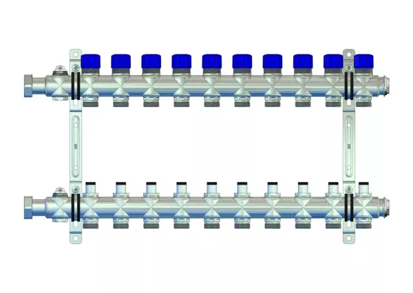 strawa FB-Anschlussverteiler e-class 53 ohne SFEE 10 Hkr.,BxHxT: 595x320x67 mm, integr. Regulierventil im VL und THV M30x1,5 im RL, Entlüftungsventil im VL und RL, Doppelwandhalter 200 mm mit Schrauben u. Dübeln