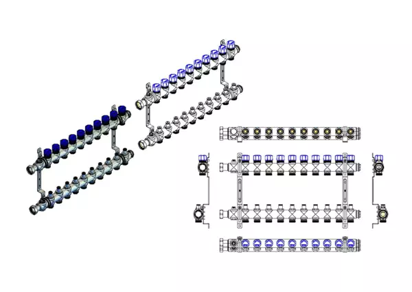 integrierte Regulierventile im Vorlaufbalken und Thermostatventileinsätze M30x1,5 im Rücklaufbalken, Entlüftungsventil im Vor- und Rücklaufbalken, Doppelwandhalter 200 mm mit Schrauben und Dübeln