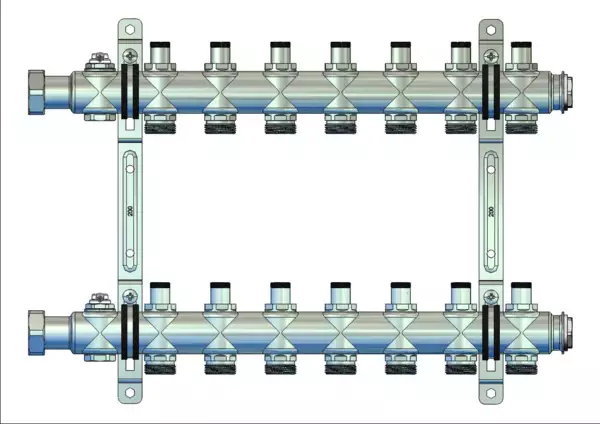 • Vorlauf- und Rücklaufbalken mit integrierten Regulierventilen mit Memoryfunktion (Kvs=2,88 m³/h)